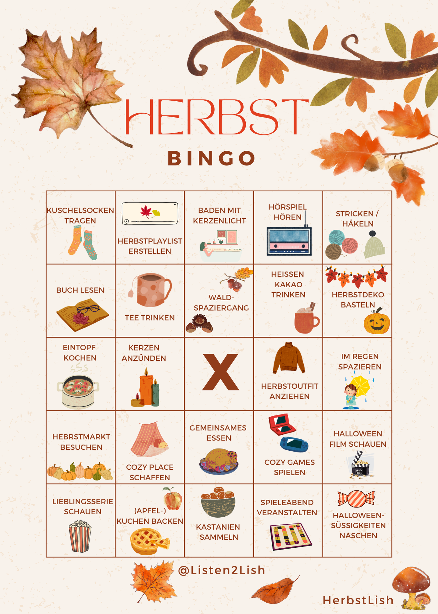 Auch Hörspiele sind eine herrLishe Begleitung für dunkle Herbstabende. Beim Hörspielhören kannst du deiner Fantasie freien Lauf lassen, entweder die Augen schließen und voll in die Geschichte eintauchen, dir eine meiner Hörspielbingokarten runterladen, die HerbstLishen Ausmalvorlagen nutzen, etwas kochen oder dein liebstes Cozy-Videospiel spielen. Mehr dazu in meinem Hörspiel-Blog.