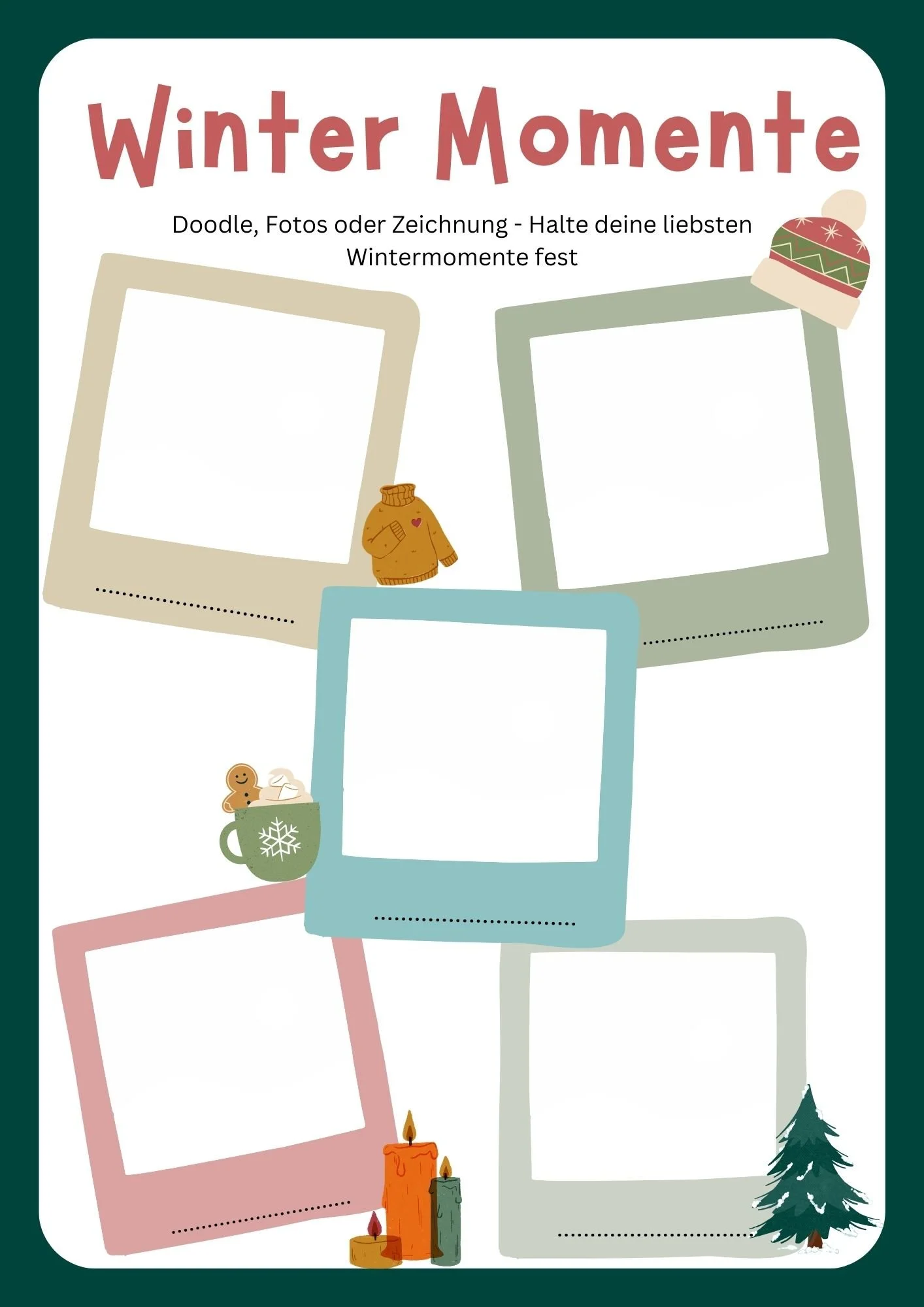 Der Winter ist voll von magischen Momenten. Mit diesem Arbeitsblatt kannst du deine schönsten Wintererinnerungen festhalten. Die Felder bieten Platz für Doodles, Fotos, Zeichnungen, Eintrittskarten oder andere kleine Andenken.
