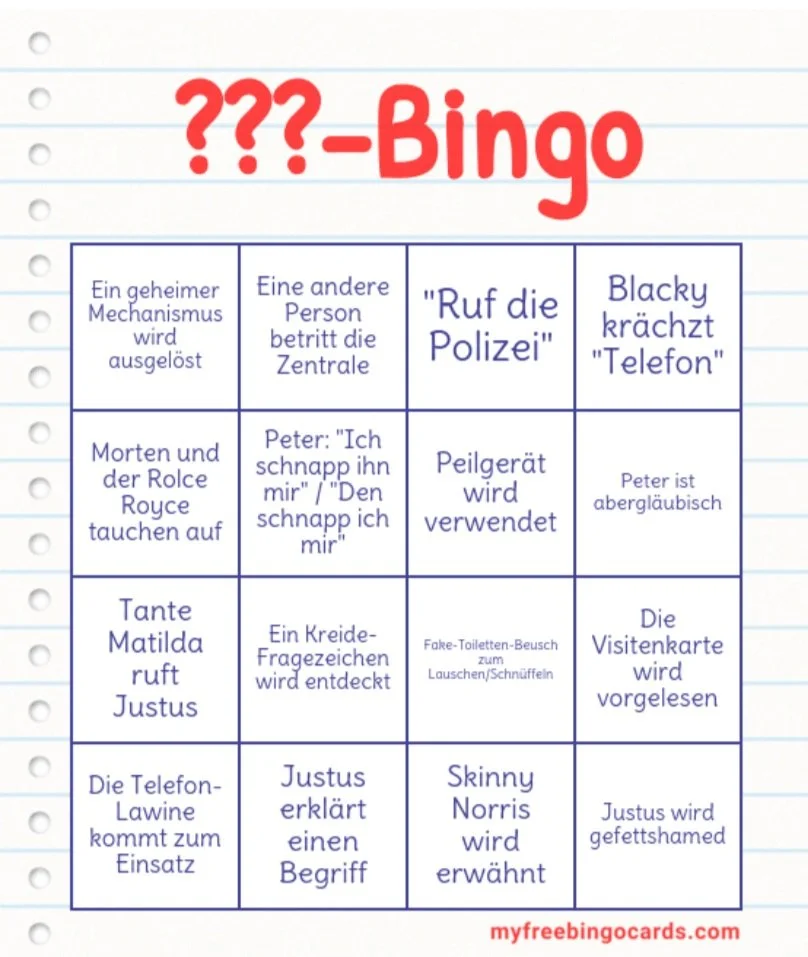 Ein kleines Spiel, das ich gerne beim Hörspielhören oder beim Serien schauen spiele, ist Bingo! Es bringt einen zusätzlichen Reiz und hilft mir beim aktiven Zuhören. Dazu erstelle ich Bingo-Karten mit typischen, wiederkehrenden Motiven der jeweiligen Reihe. Mit dem Online-Generator von myfreebingocards kann ich diese Karten randomisieren und anpassen. Wenn ihr ein persönliches Bingo erstellen wollt, bietet die Seite verschiedene Designs und eine einfache Handhabung – probiert es gern selbst mal aus! Ihr könnt die Karten online abstreichen oder ausdrucken. Ich habe eine kleine Sammlung für euch erstellt, die ihr gerne nutzen könnt.